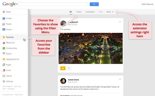 Or, if you use Chrome, you can give Favorite Posts for Google+ a try. Once installed, the extension automatically adds a star button at the bottom of each post in your stream. Clicking it will allow you to save the post in a separate section of your profile. To access it, click the “Favorites” tab in the left-hand menu.